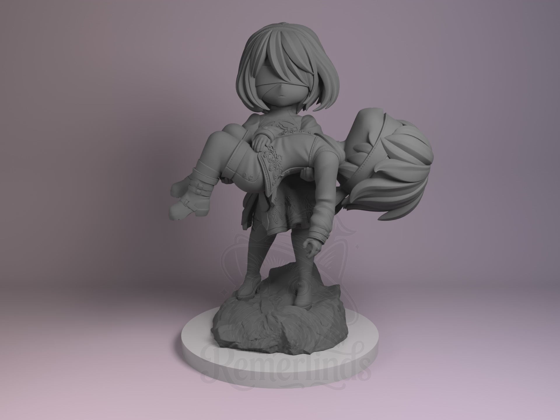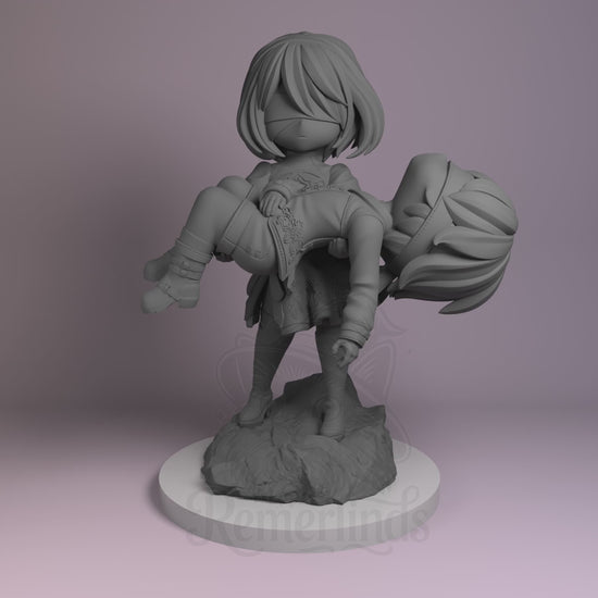2B and 9S from Nier Automata as a 3D printed resin chibi model kit by Nomnom Figures — unpainted 16K print ready to assemble and paint. The sculpt captures 2B gently carrying 9S in a serene and emotional pose.