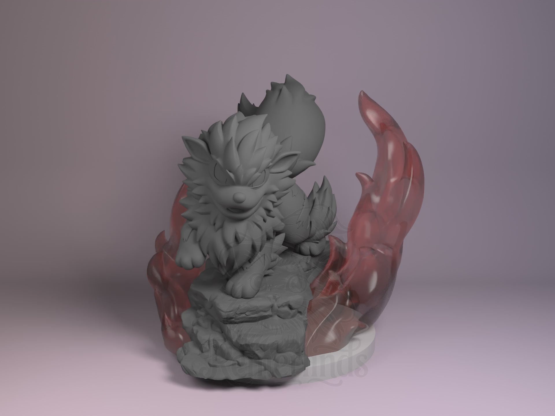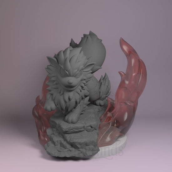 - Resin-printed model of Chibi Arcanine posed atop a rocky base with flame effects