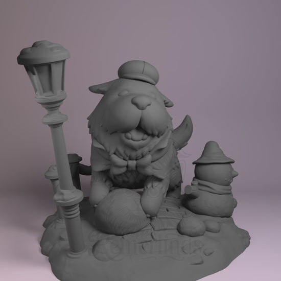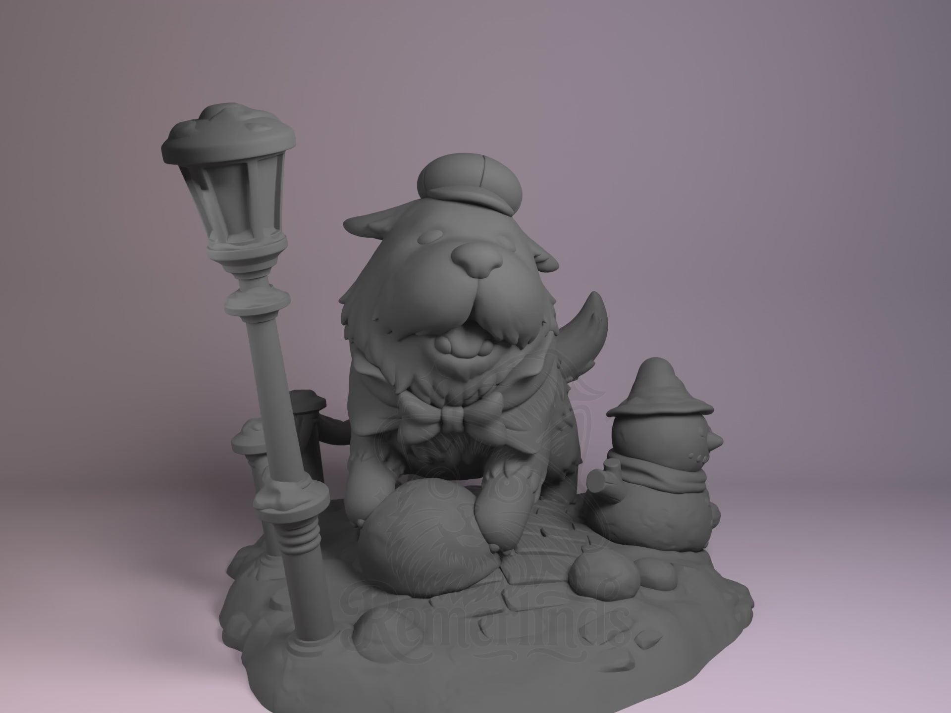 Bond from *Spy Family* as a 3D printed resin figure by Nomnom Figures — unpainted 16K print ready to assemble and paint. This chibi sculpt shows the loyal dog sitting proudly beside a lamp post and a miniature snowman companion, capturing his calm and dependable nature in a cozy winter scene.