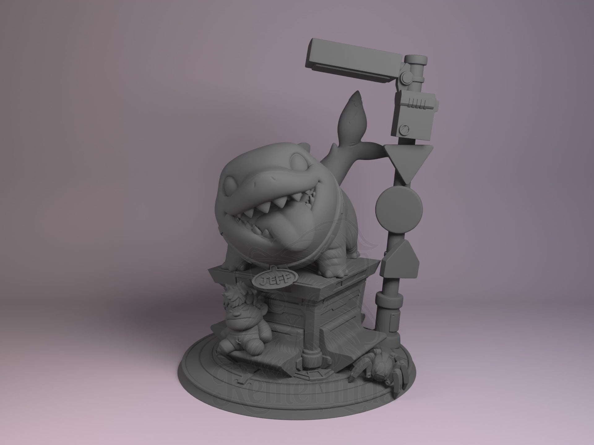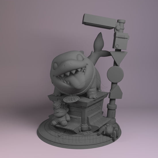 Chibi Shark Pal from *Tiny Hero Companion* as a 3D printed resin figure by Nomnom Figures — unpainted 16K print ready to assemble and paint. This joyful chibi captures the adorable land shark perched atop a street sign with his trusty companion below, blending cuteness and chaos in perfect harmony.