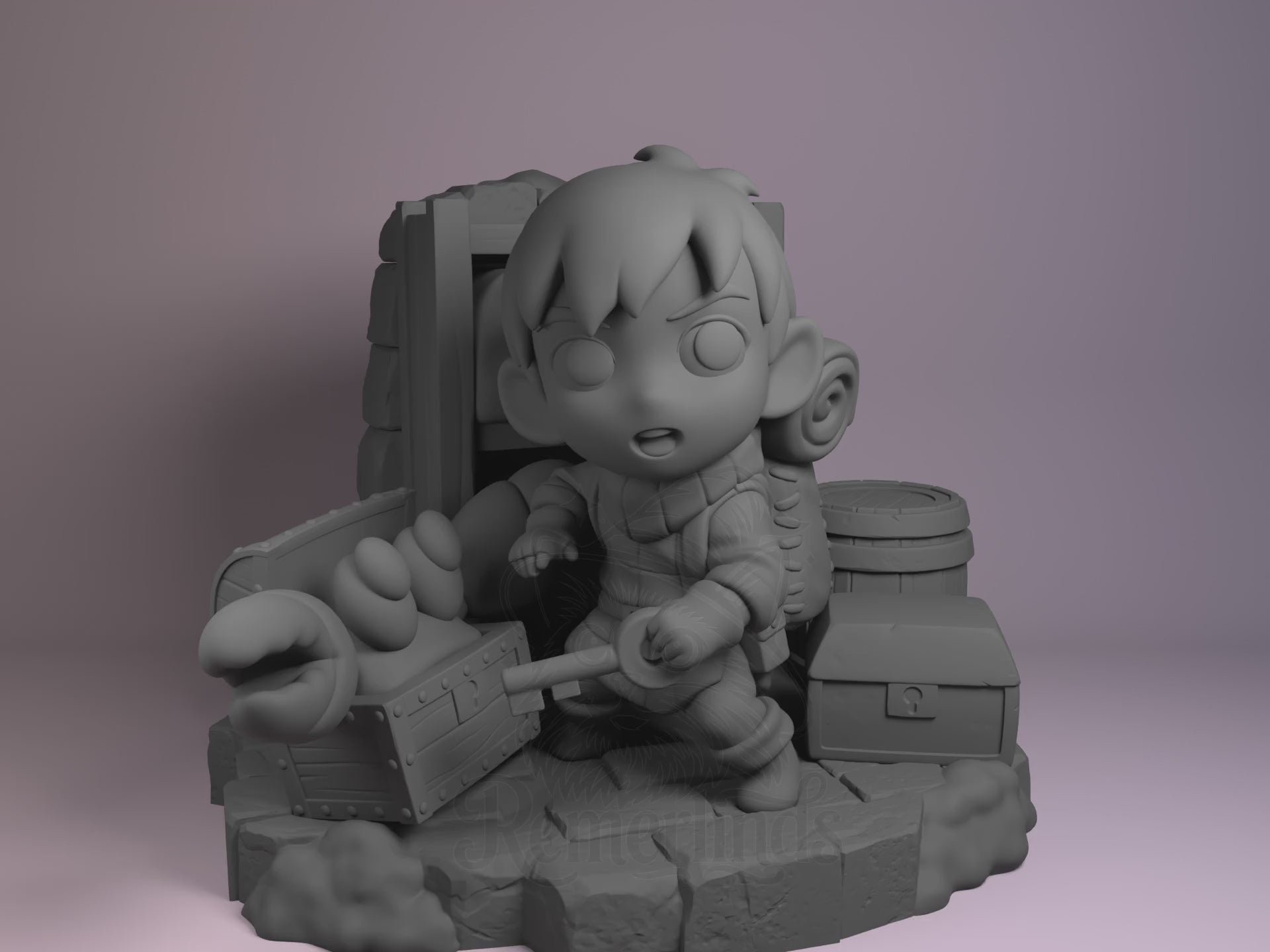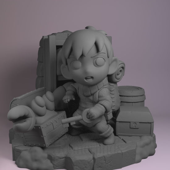- Resin-printed model of Chibi Chilchuck kneeling beside a trapped treasure chest
