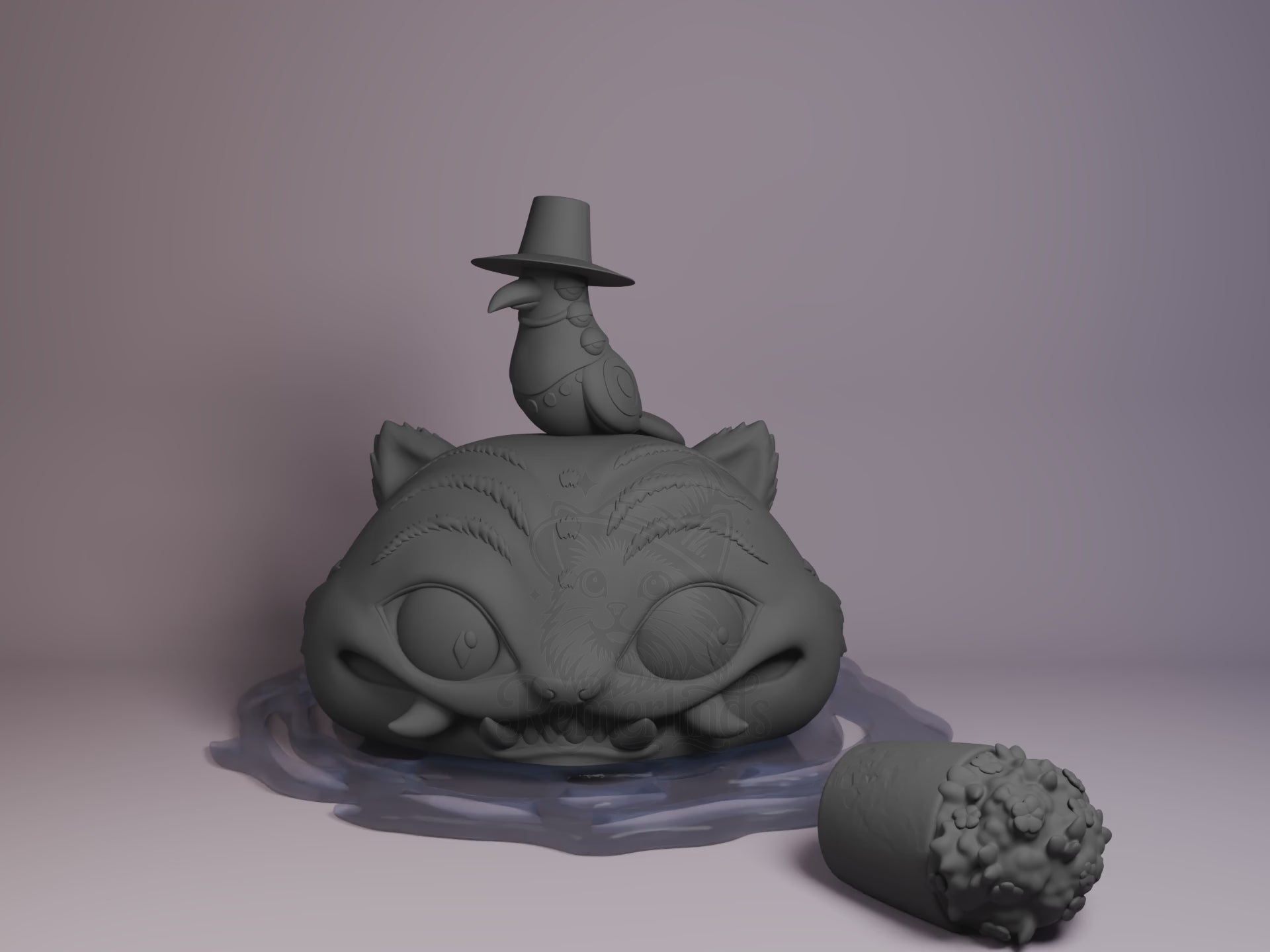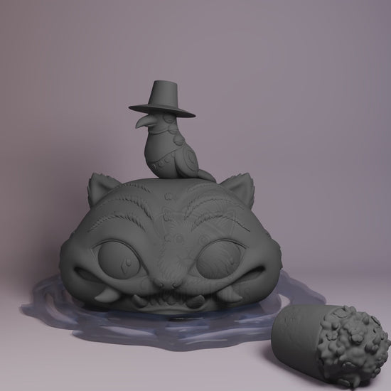 Derpy Tiger from *KPop Demon Hunters* as a 3D printed resin figure by Nomnom Figures — unpainted 16K print with optional transparent portal effect, ready to assemble and paint. This hilarious chibi sculpt captures the tiger emerging through a dimensional rift, complete with its signature deadpan expression and a bird companion perched confidently on its head.