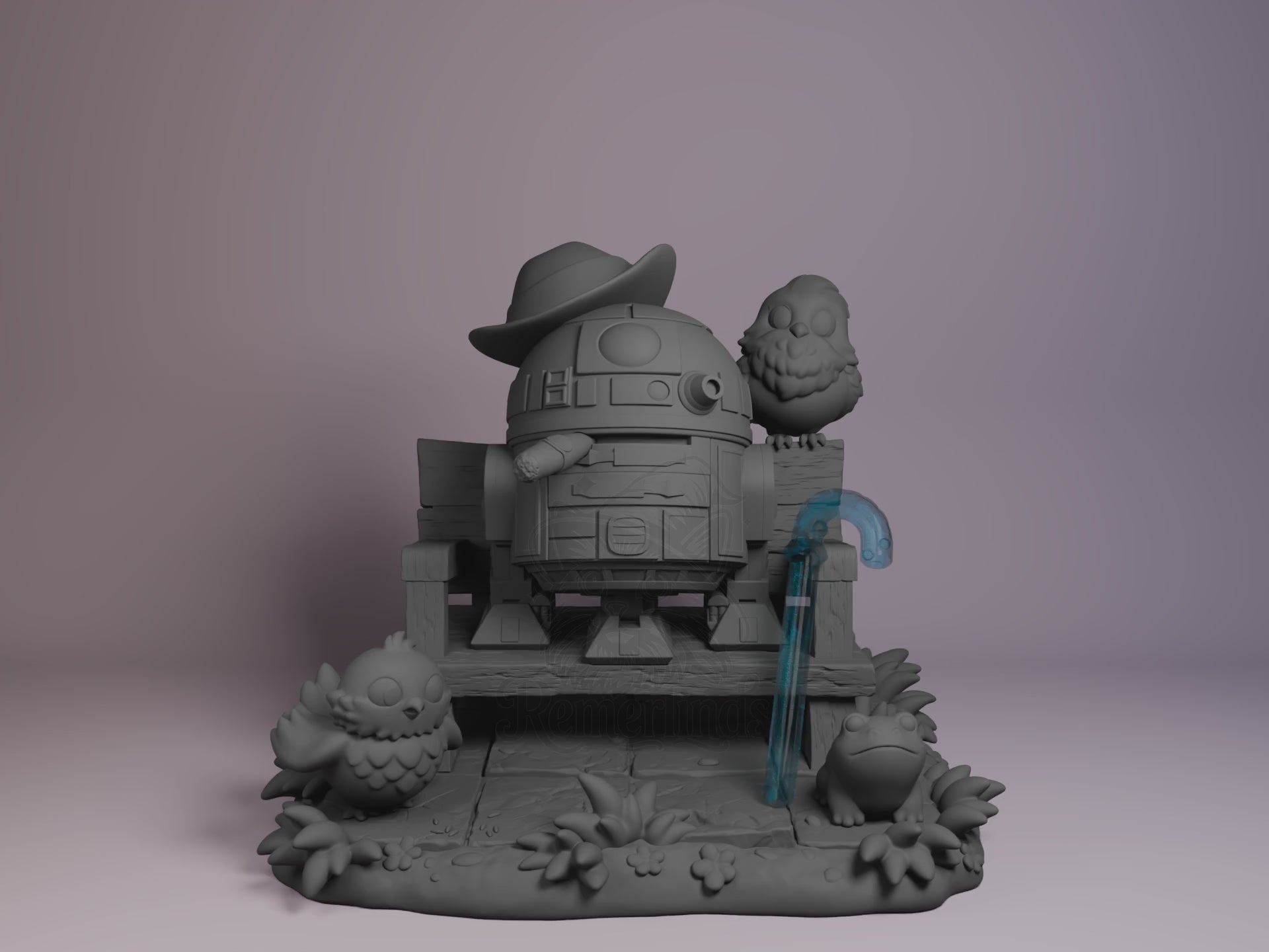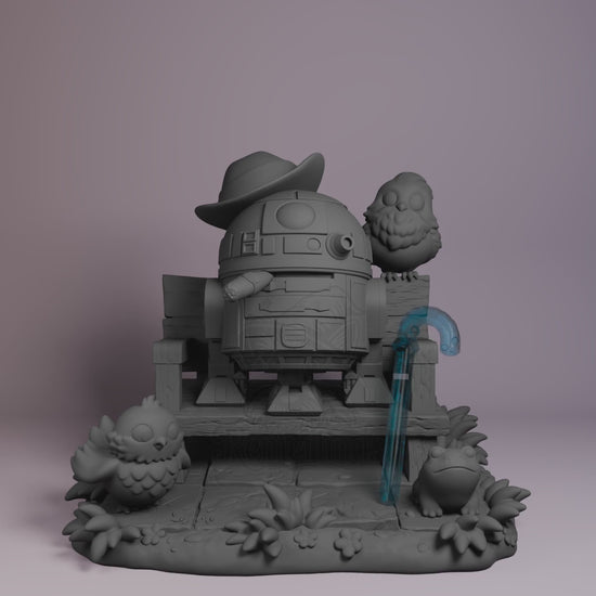 Droid Ranger from the Galactic Legends universe as a 3D printed resin figure by Nomnom Figures — unpainted 16K print with optional transparent lightsaber effect, ready to assemble and paint. This chibi reimagining of a classic galactic explorer sits calmly on a forest bench, surrounded by adorable owls and forest critters, hat tilted like a wandering cowboy.