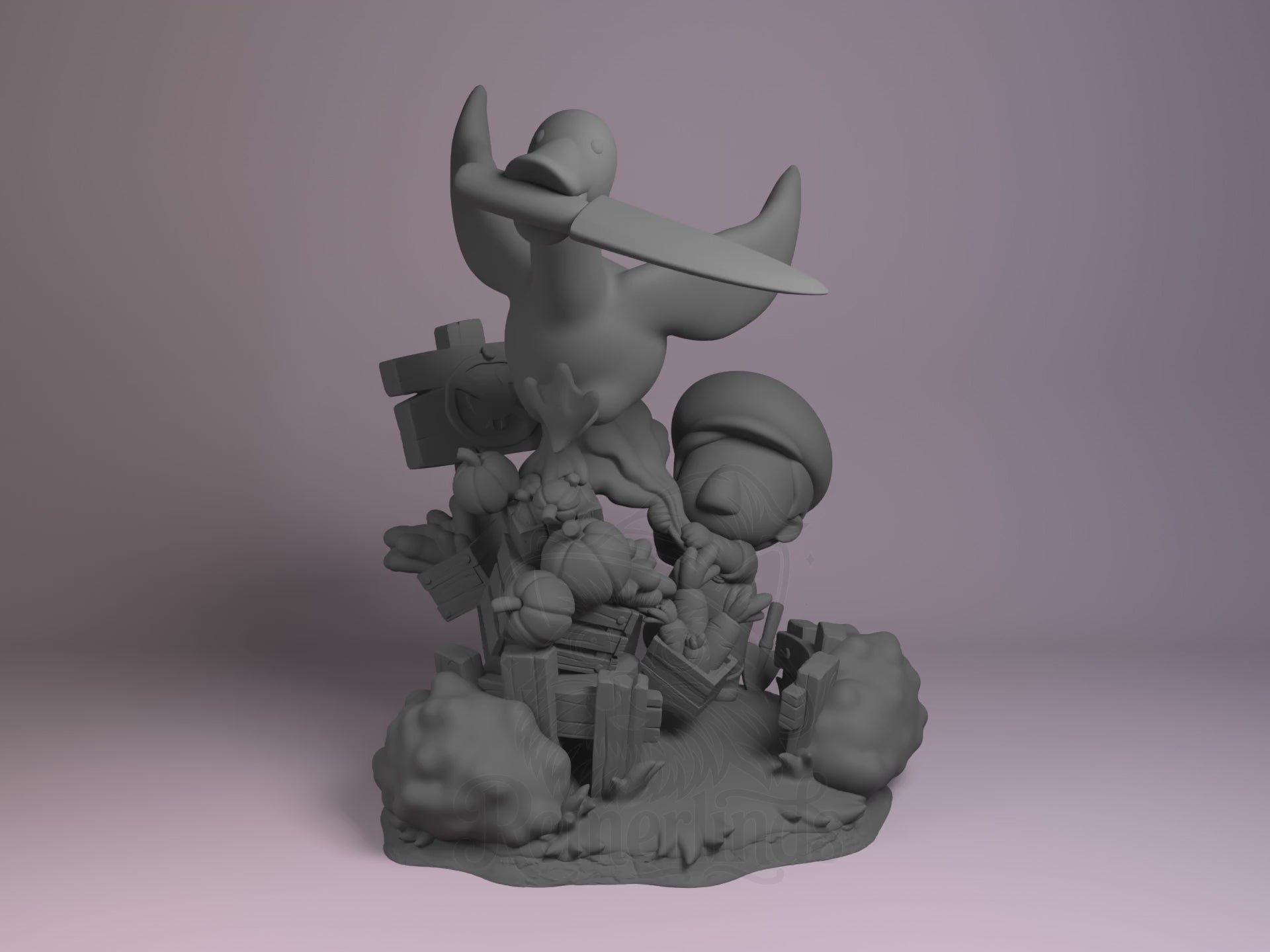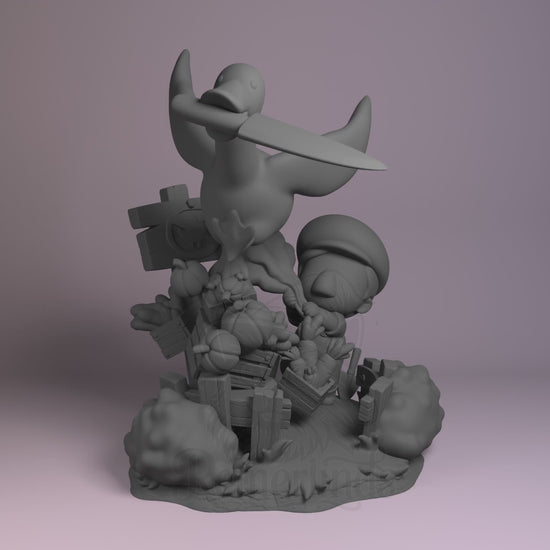 Goose from *Untitled Goose Game* as a 3D printed resin figure by Nomnom Figures — unpainted 16K print ready to assemble and paint. This chibi sculpture captures the mischievous goose mid-honk, sword in beak, surrounded by stolen treasures and chaos. A perfect collectible for fans of stealthy mayhem and playful mischief.