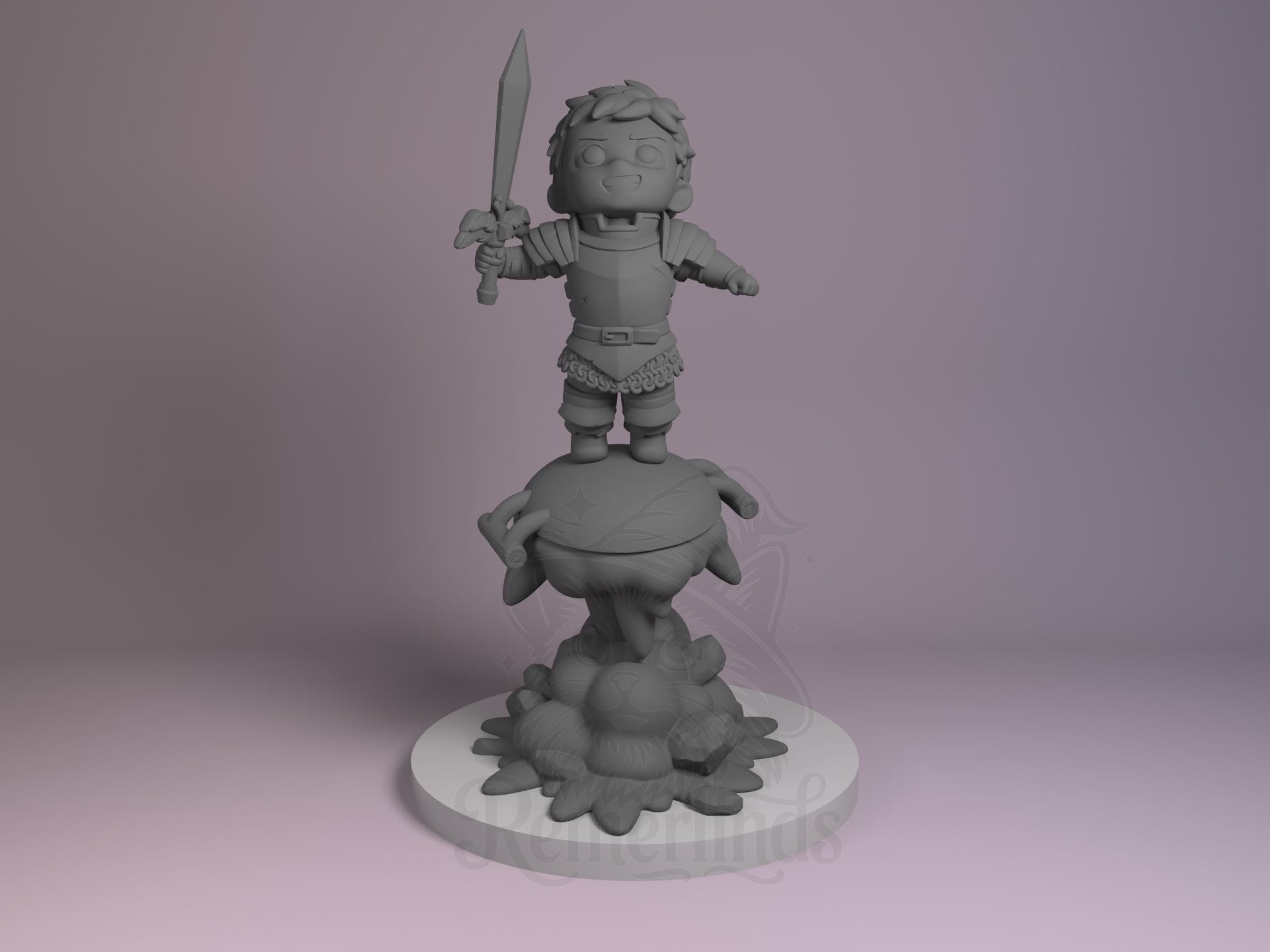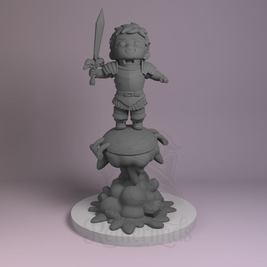 - Resin-printed model of Chibi Laios Touden raising his sword on a monster-shaped base