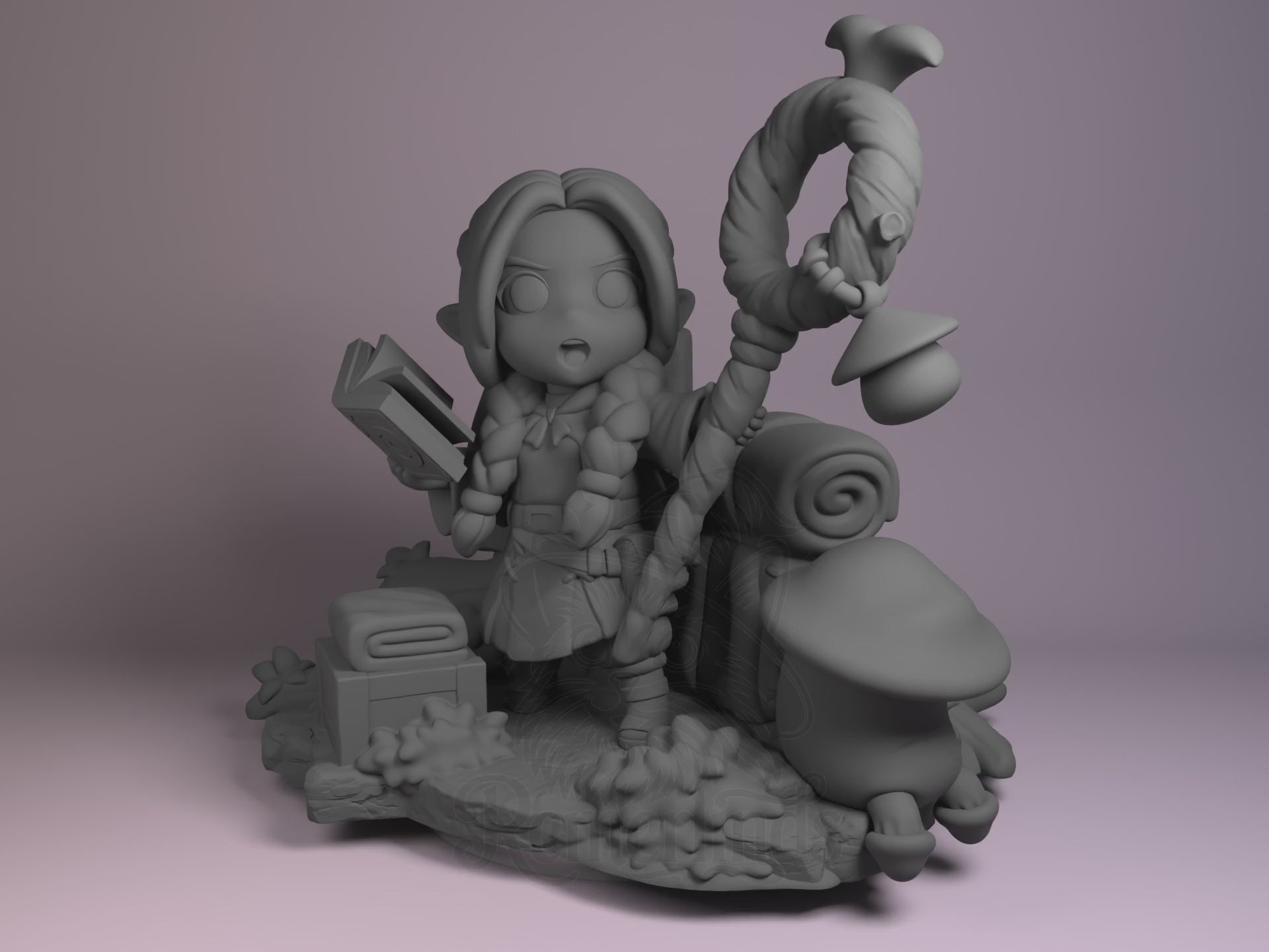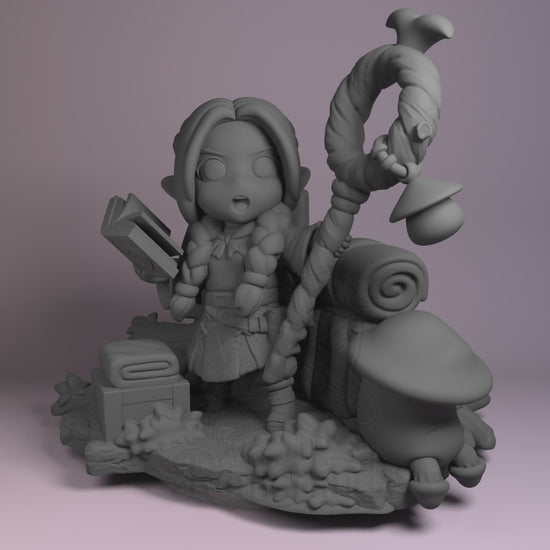 Marcille from Dungeon Meshi as a 3D printed resin figure by Nomnom Figures — unpainted 16K print ready to assemble and paint. This chibi version captures the elven mage mid-spell, book in hand, surrounded by her travel gear and enchanted mushrooms. A perfect centerpiece for fans of fantasy and culinary adventures alike.