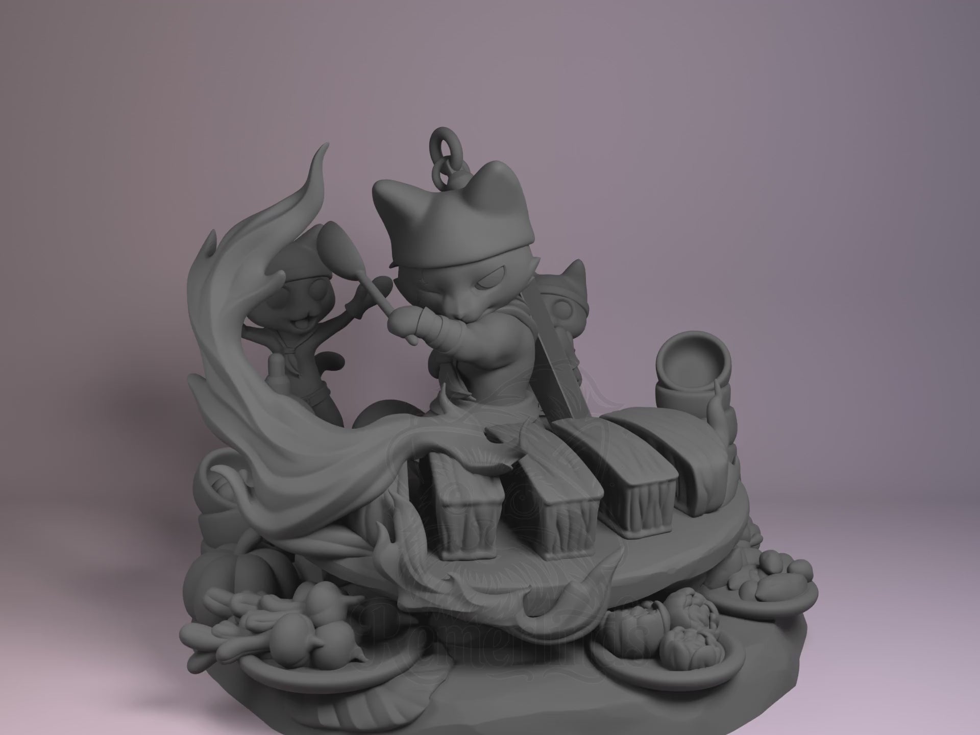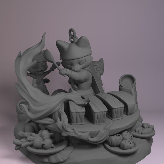 Meowscular Chef from Monster Hunter as a 3D printed resin figure by Nomnom Figures — unpainted 16K print ready to assemble and paint. This chibi scene captures the legendary feline chef mid-cooking, surrounded by a lavish feast of meats and vegetables, perfectly sculpted for fans of the Monster Hunter kitchen.