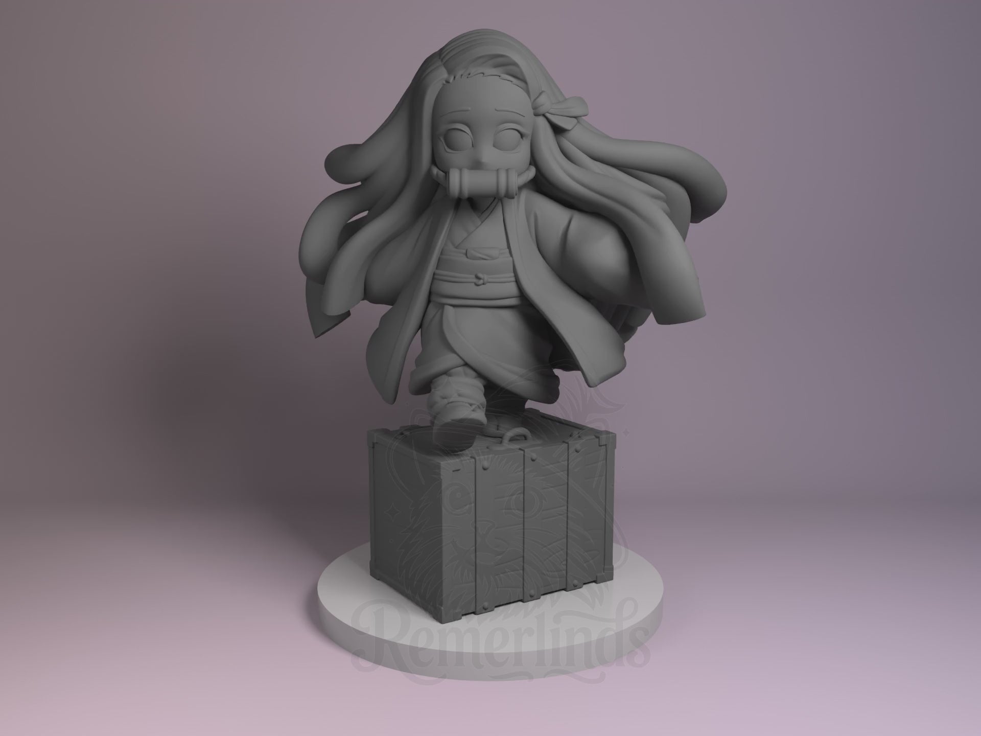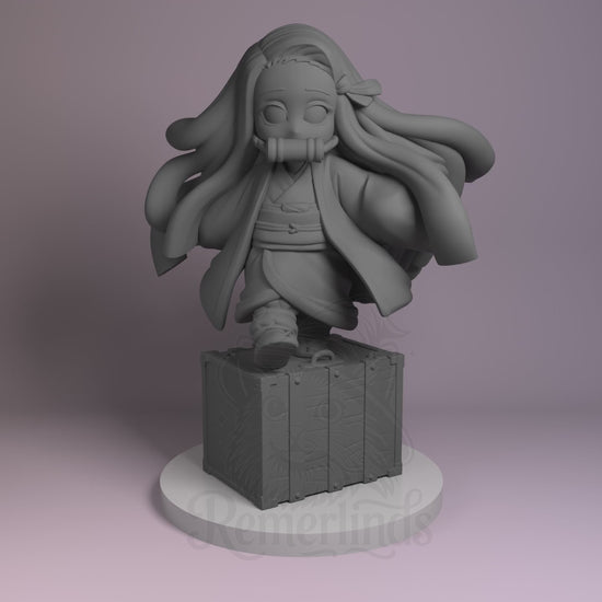 - Resin-printed model of Chibi Nezuko stepping forward atop her wooden box base