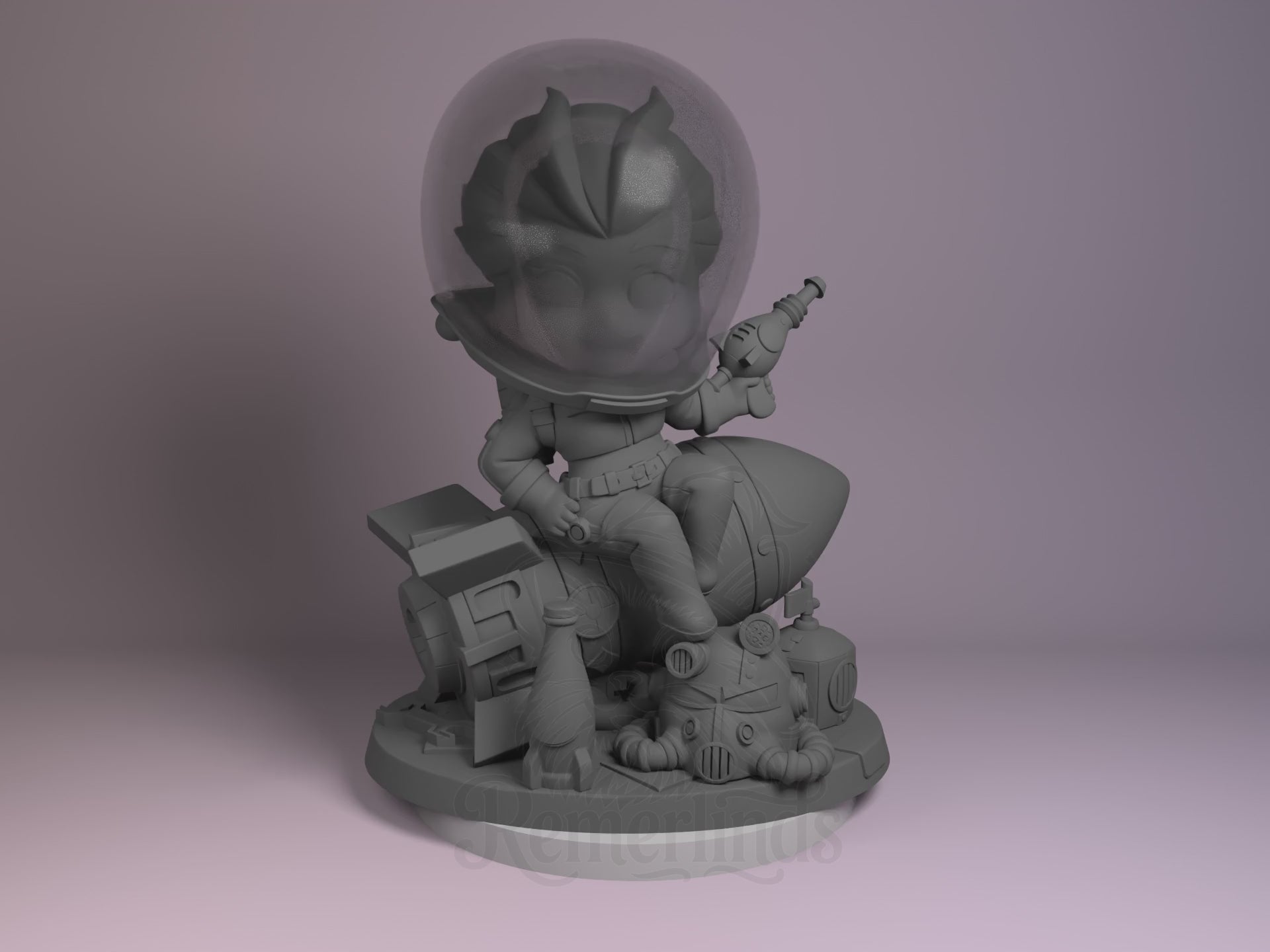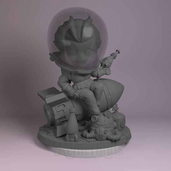 Nuka Girl from Fallout 4 as a 3D printed resin figure by Nomnom Figures — unpainted 16K print with optional transparent helmet, ready to assemble and paint. This chibi version of the iconic space pin-up features her raygun, rocket base, and signature bubble helmet for an unmistakably retro-futuristic look.