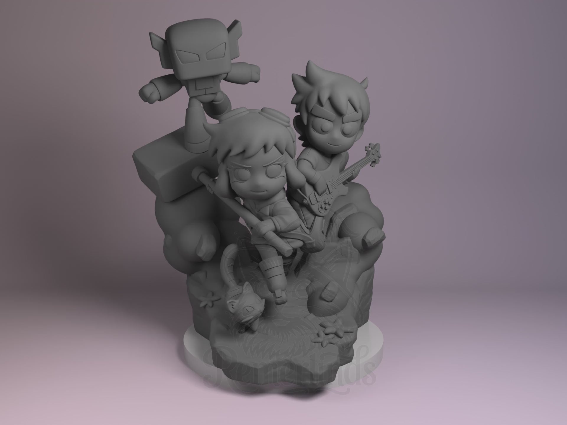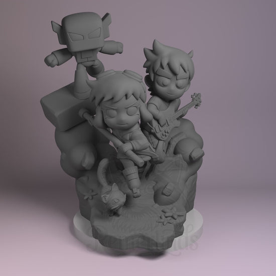 Ramona Flowers from Scott Pilgrim Takes Off as a 3D printed resin figure by Nomnom Figures — unpainted 16K print ready to assemble and paint. This chibi captures Ramona mid-performance with her iconic bass, surrounded by musical chaos and her trusty floating companion, bursting with energy and personality.