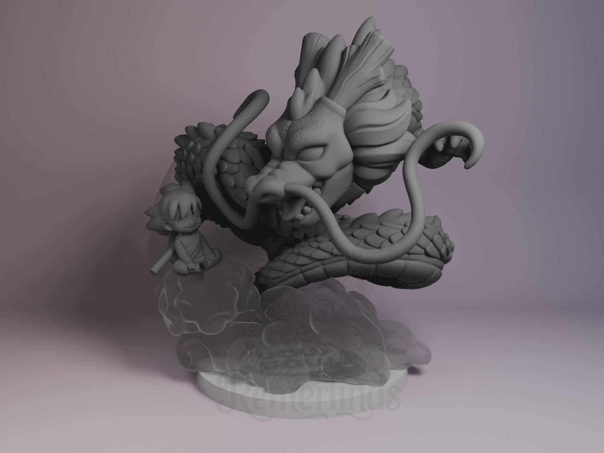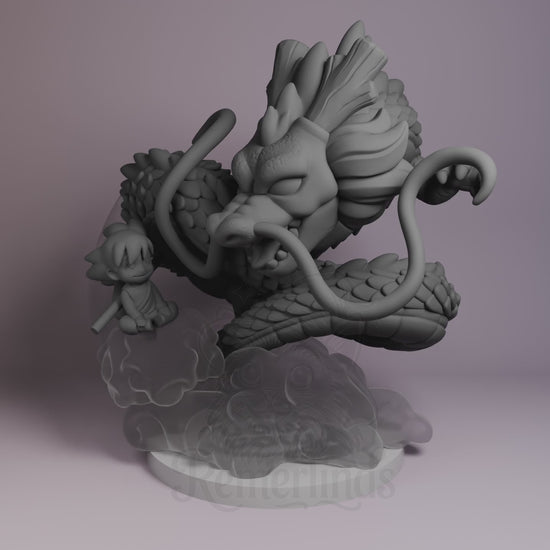 Shenron and Goku from Dragon Ball as a 3D printed resin figure by Nomnom Figures — unpainted 16K print with optional transparent smoke and cloud effects, ready to assemble and paint.