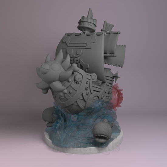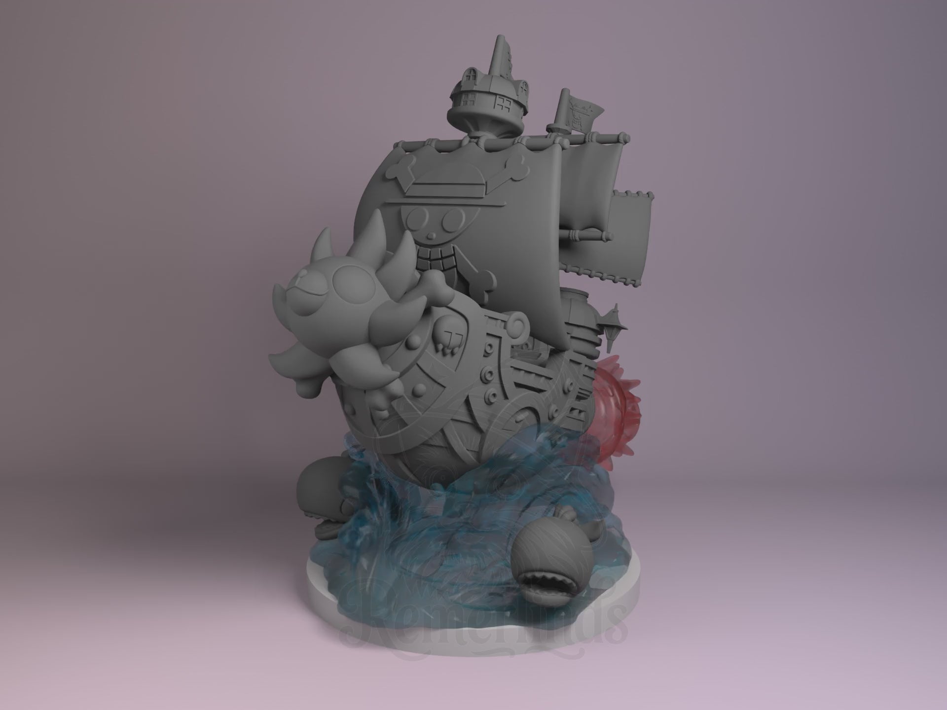 - Resin-printed model of Chibi Thousand Sunny sailing atop a dynamic base with water and flame effects