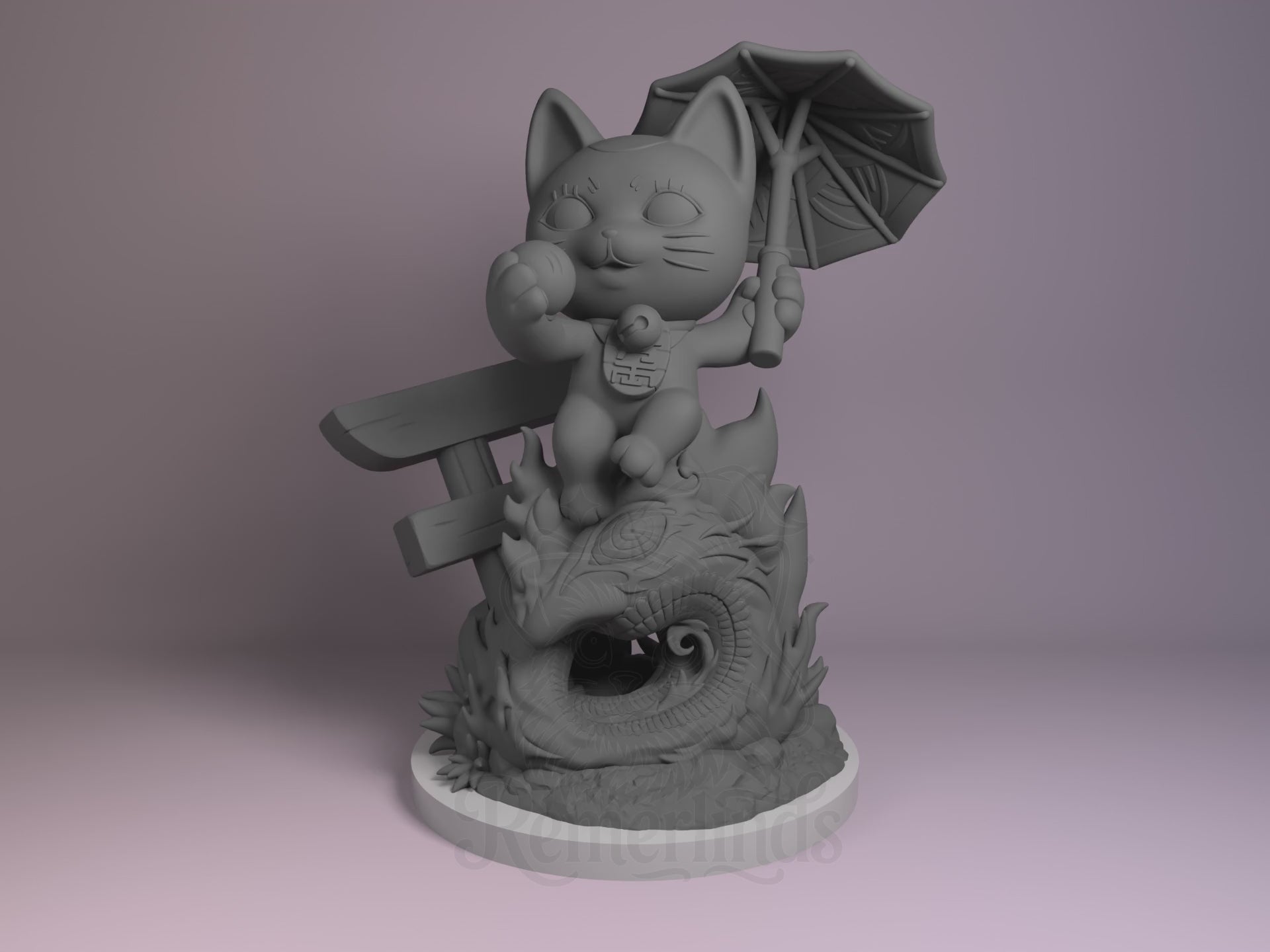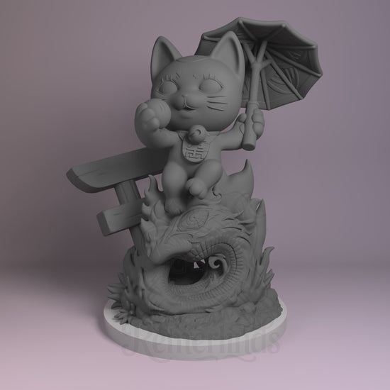 - Resin-printed model of Chibi Turbo Granny Cat holding an umbrella atop a dragon base