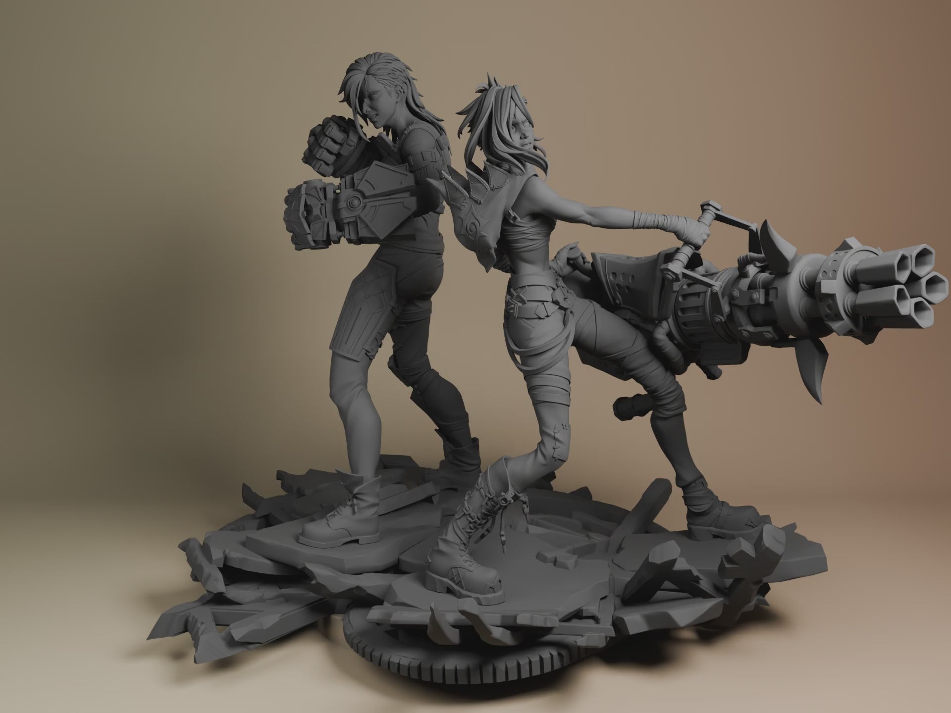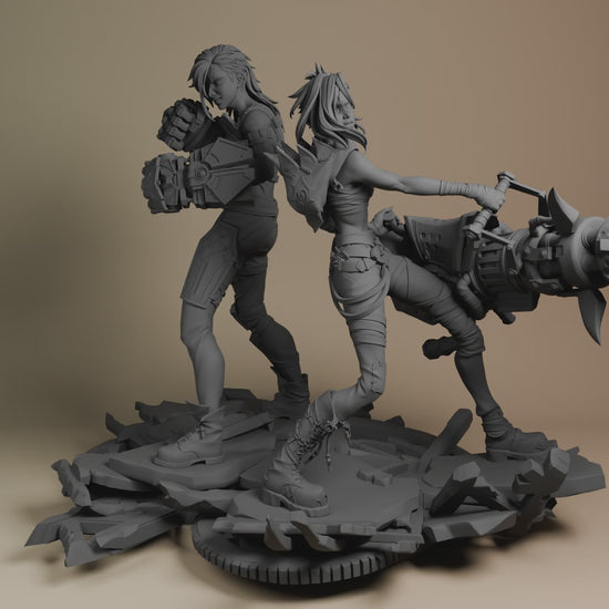 Dynamic twin-character diorama of Jinx and Vi standing back-to-back amid shattered debris, weapons drawn and ready for battle. Unpainted resin kit, ready for your assembly and paint.