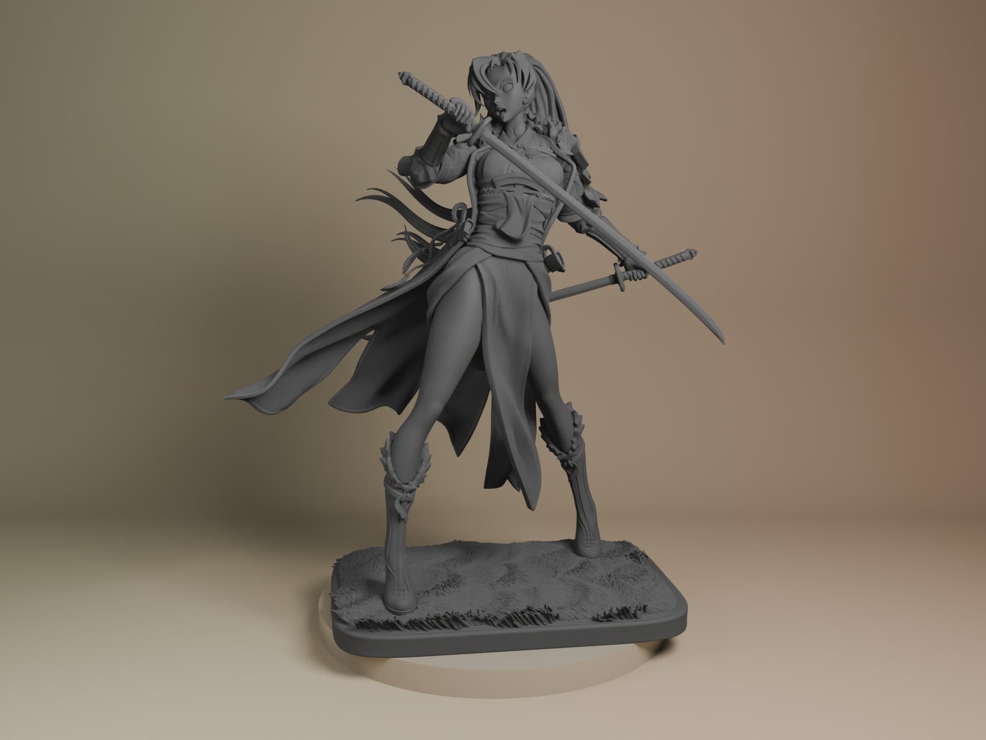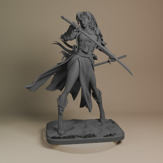 Graceful warrior stance drawing her katana with wind-swept cloak and detailed base texture. Unpainted resin kit, ready for your assembly and paint.