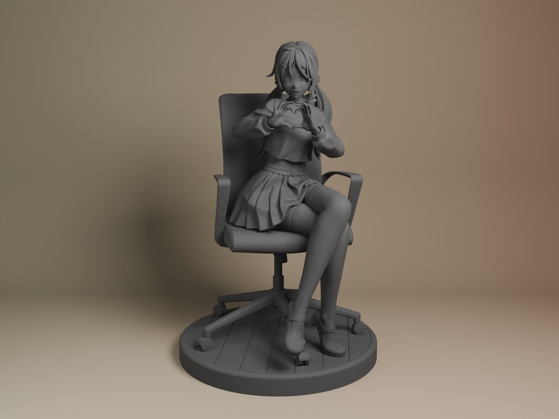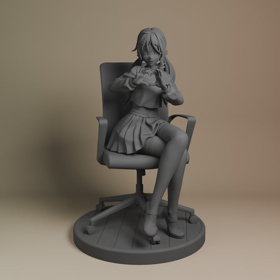 Relaxed seated pose with heart-hand gesture on an office chair base. Unpainted resin kit, ready for your assembly and paint.