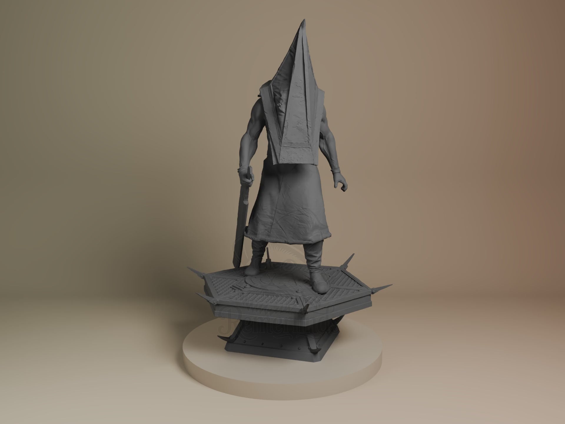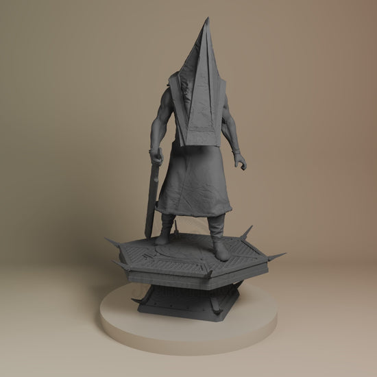 A chilling 16K sculpt of Pyramid Head from Silent Hill, standing atop a spiked industrial base with his massive blade in hand. Every torn texture and fold is faithfully reproduced, capturing the eerie weight of this iconic monster. Unpainted resin kit for skilled painters and collectors.