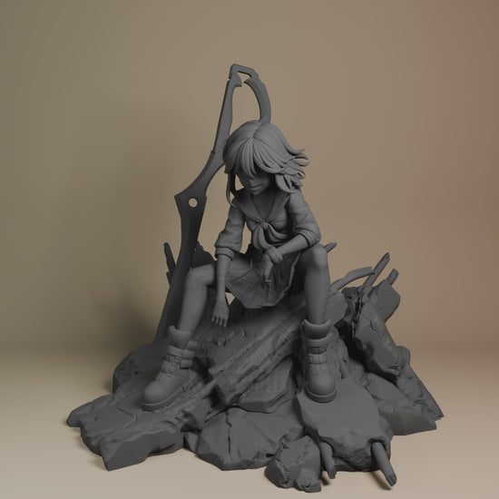 A powerful 16K sculpt of Ryuko Matoi from Kill la Kill, resting in a defiant pose among shattered concrete and her iconic scissor blade. This unpainted resin model kit brings out every fabric fold and surface detail for advanced painters and collectors.