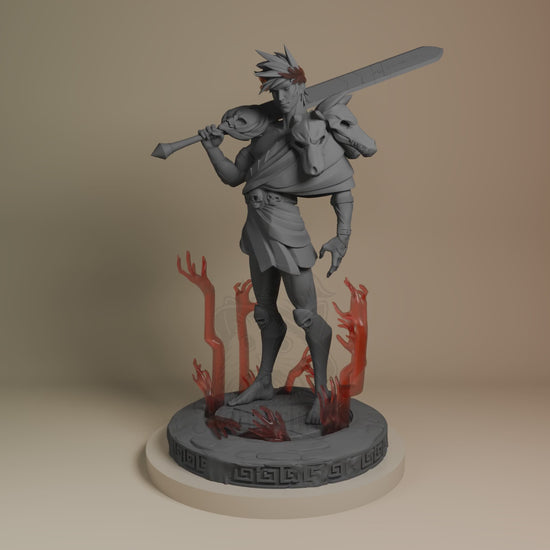 Dynamic stance with sword resting on shoulder and rising flame effects at his feet. Unpainted resin kit, ready for your assembly and paint.