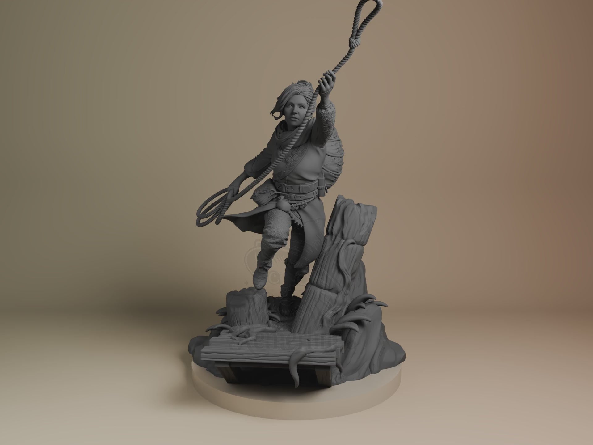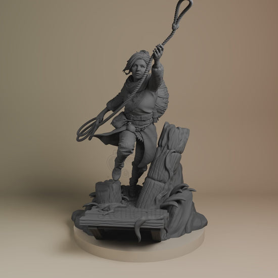 Dynamic mid-action pose with rope raised overhead and foot braced against a broken pier. Unpainted resin kit, ready for your assembly and paint.